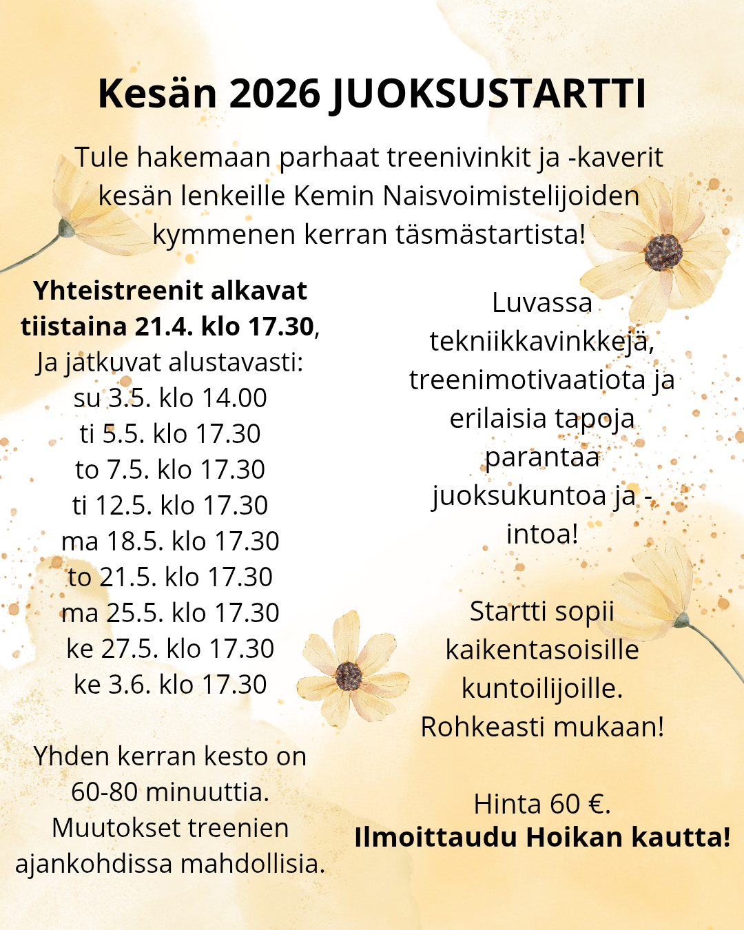 Tule hakemaan parhaat treenivinkit ja -kaverit kesän lenkeille Kemin Naisvoimistelijoiden kymmenen kerran täsmästartista! Aloitetaan 21.4., hinta 60 €, ohjaajana Leena. Startti sopii kaikentasoisille…